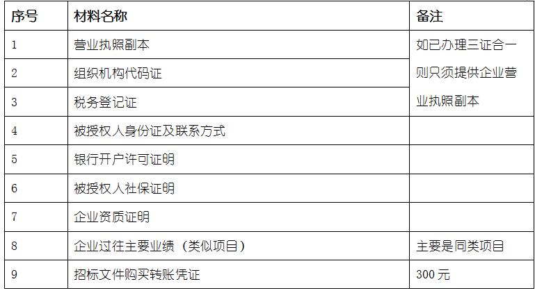 2、 凡有意向參加投標(biāo)者,請在上述期間內(nèi)按下表提供報名資料,相關(guān)證明文件的原件如無法提供原件則提供復(fù)印件加蓋公司公章,投標(biāo)人須將上述資料的掃描件發(fā)郵件至招標(biāo)聯(lián)系人處進(jìn)行報名。