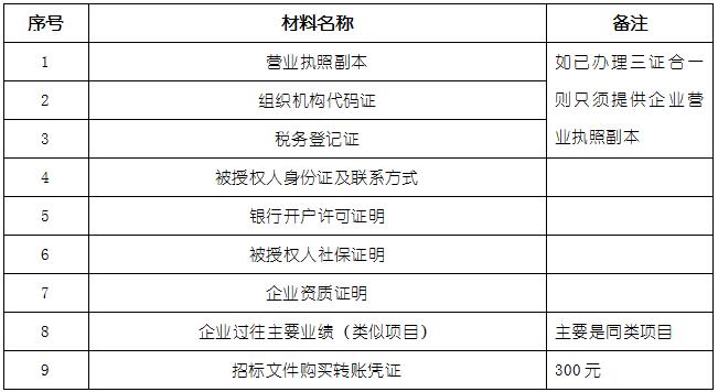 2、 凡有意向參加投標者,請在上述期間內按下表提供報名資料,相關證明文件的原件如無法提供原件則提供復印件加蓋公司公章,投標人須將上述資料的掃描件發郵件至招標聯系人處進行報名。