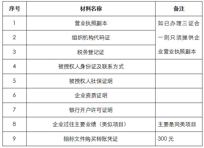 2、 凡有意向參加投標者,請在上述期間內按下表提供報名資料,相關證明文件的原件如無法提供原件則提供復印件加蓋公司公章,投標人須將上述資料的掃描件發郵件至招標聯系人處進行報名。