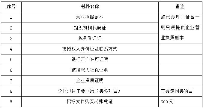 2、 凡有意向參加投標者,請在上述期間內按下表提供報名資料,相關證明文件的原件如無法提供原件則提供復印件加蓋公司公章,投標人須將上述資料的掃描件發郵件至招標聯系人處進行報名。