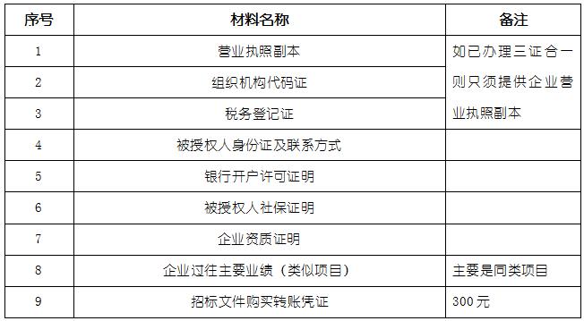 2、 凡有意向參加投標(biāo)者,請(qǐng)?jiān)谏鲜銎陂g內(nèi)按下表提供報(bào)名資料,相關(guān)證明文件的原件如無(wú)法提供原件則提供復(fù)印件加蓋公司公章,投標(biāo)人須將上述資料的掃描件發(fā)郵件至招標(biāo)聯(lián)系人處進(jìn)行報(bào)名。