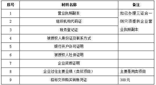2、 凡有意向參加投標者,請在上述期間內按下表提供報名資料,相關證明文件的原件如無法提供原件則提供復印件加蓋公司公章,投標人須將上述資料的掃描件發郵件至招標聯系人處進行報名。