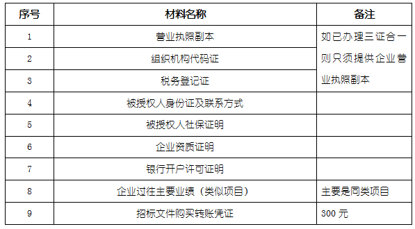 2、 凡有意向參加投標者,請在上述期間內按下表提供報名資料,相關證明文件的原件如無法提供原件則提供復印件加蓋公司公章,投標人須將上述資料的掃描件發郵件至招標聯系人處進行報名。