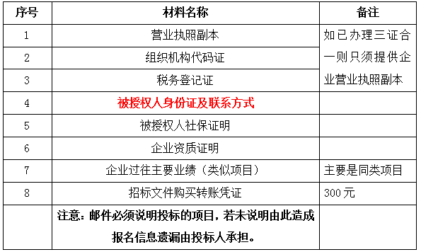2、 凡有意向參加投標者,請在上述期間內按下表提供報名資料,相關證明文件的原件如無法提供原件則提供復印件加蓋公司公章,投標人須將上述資料的掃描件發郵件至招標聯系人處進行報名。