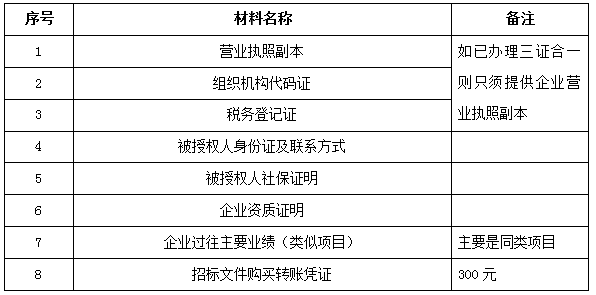 2、 凡有意向參加投標(biāo)者,請在上述期間內(nèi)按下表提供報名資料,相關(guān)證明文件的原件如無法提供原件則提供復(fù)印件加蓋公司公章,投標(biāo)人須將上述資料的掃描件發(fā)郵件至招標(biāo)聯(lián)系人處進(jìn)行報名。