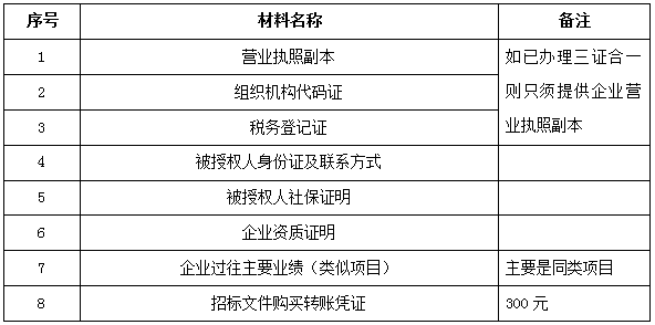2、 凡有意向參加投標者,請在上述期間內(nèi)按下表提供報名資料,相關(guān)證明文件的原件如無法提供原件則提供復印件加蓋公司公章,投標人須將上述資料的掃描件發(fā)郵件至招標聯(lián)系人處進行報名。