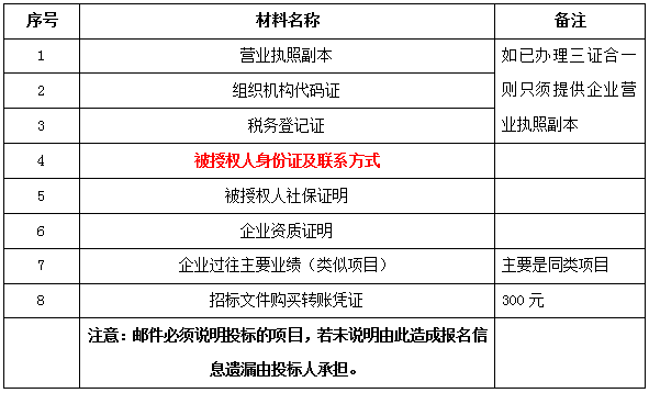 2、 凡有意向參加投標者,請在上述期間內按下表提供報名資料,相關證明文件的原件如無法提供原件則提供復印件加蓋公司公章,投標人須將上述資料的掃描件發郵件至招標聯系人處進行報名。