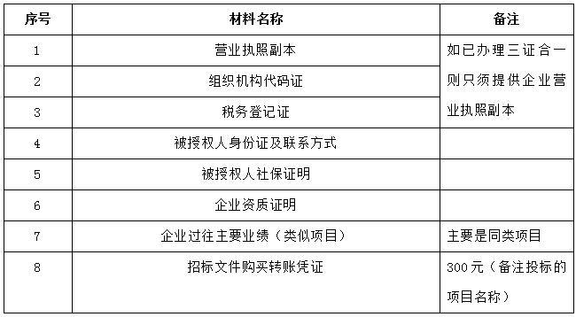 2、 凡有意向參加投標(biāo)者,請在上述期間內(nèi)按下表提供報名資料,相關(guān)證明文件的原件如無法提供原件則提供復(fù)印件加蓋公司公章,投標(biāo)人須將上述資料的掃描件發(fā)郵件至招標(biāo)聯(lián)系人處進(jìn)行報名。