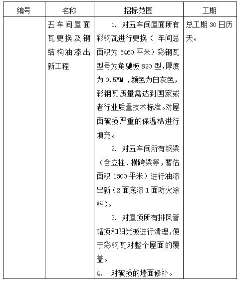 2、 工程規(guī)模: 彩鋼瓦進行更換車間總面積為5460平米,五車間所有鋼梁含立柱、橫跨梁等,暫估面積1300平米,進行油漆出新以及其他零星墻面修補。