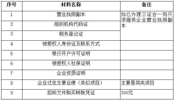 3、 凡有意向參加投標(biāo)者,請(qǐng)?jiān)谏鲜銎陂g內(nèi)按下表提供報(bào)名資料,相關(guān)證明文件的原件如無(wú)法提供原件則提供復(fù)印件加蓋公司公章,投標(biāo)人須將上述資料的掃描件發(fā)郵件至招標(biāo)聯(lián)系人處進(jìn)行報(bào)名。