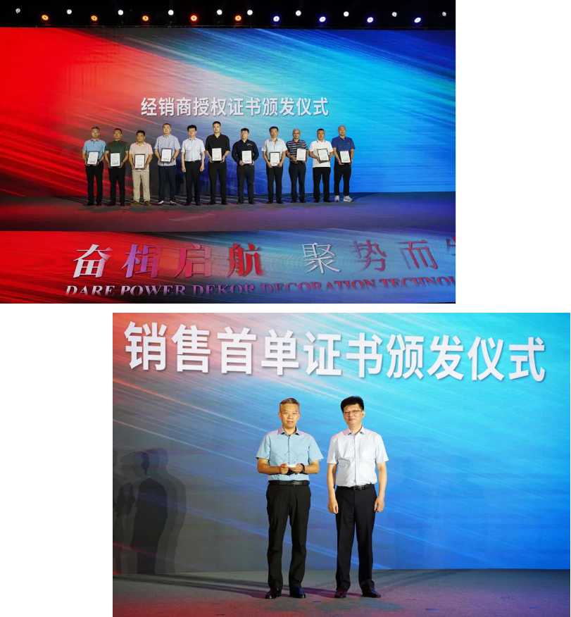 在經銷商簽約儀式環節,大亞集團副總裁、大亞人造板集團董事長眭敏向各區經銷商代表頒發授權證書,為山東山谷林泉木業有限公司王雷王總頒發大亞圣象飾面板銷售首單證書。大亞圣象的藍圖將與合作伙伴共同繪就,攜手同行再造新輝煌!