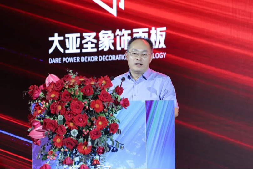 活動伊始,圣象強化制造總經理、大亞人造板丹陽工廠總經理、大亞飾面板(江蘇)有限公司總經理馬龍致歡迎辭,他代表大亞圣象飾面板項目全體成員對與會嘉賓表示誠摯的謝意,并回顧了項目從立項、研發、生產到銷售的心路歷程。他講到:“我們秉承著產品第一、精雕細琢的理念,不斷地推倒重來、不斷地優化花色和工藝,通過大半年的時間才將產品定型。地板制造多年來沉淀的技術優勢加上產業上游各供應鏈伙伴的大力支持,讓我們在飾面材料、表現力、功能性上有著獨特的競爭力。