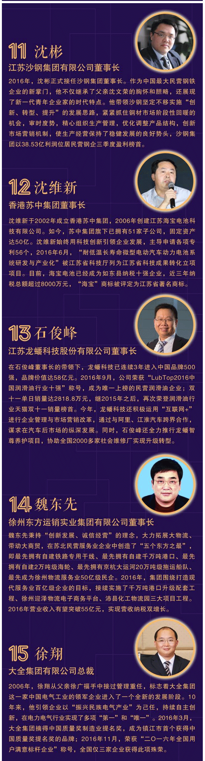 “2017第11屆蘇商領袖年會”即將在南京盛大舉行。屆時,“2016蘇商十大年度經濟人物”將重磅登場,從社會關注、業界影響、商業變革、社會責任感等多角度彰顯江蘇企業家的獨特魅力。
