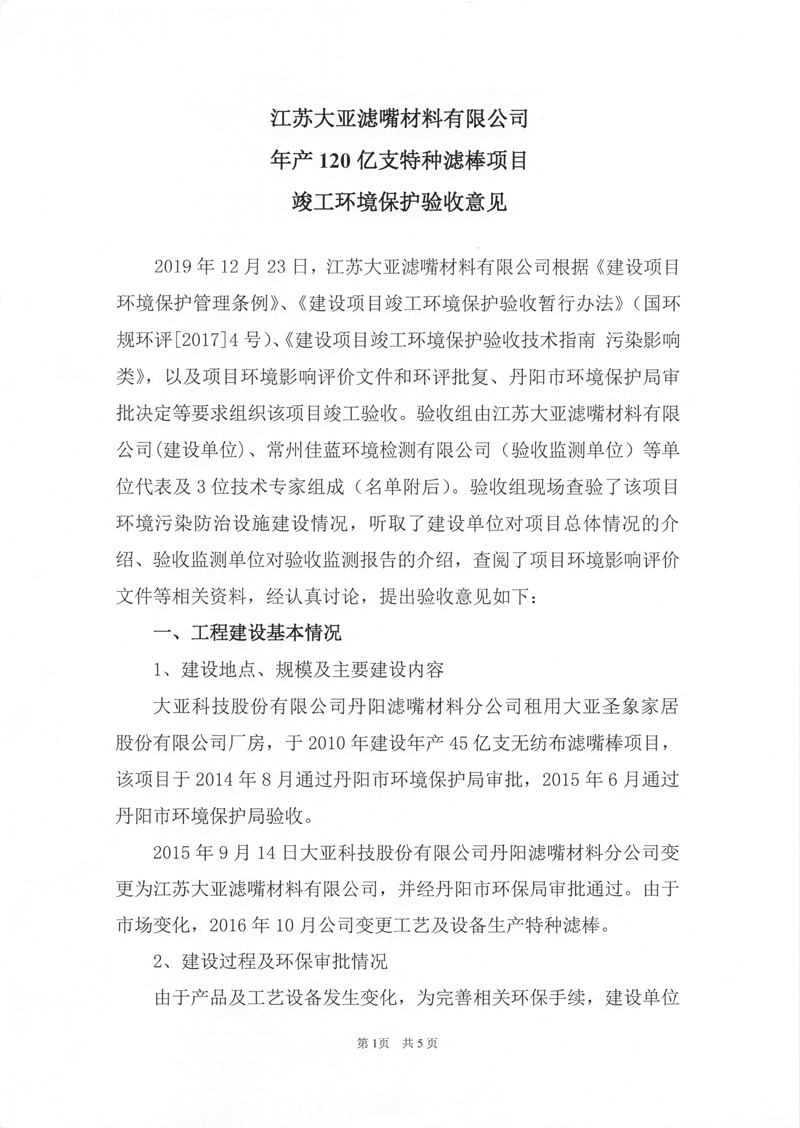江蘇大亞濾嘴材料有限公司年產120億支特種濾棒項目環境保護驗收監測情況自主公示
