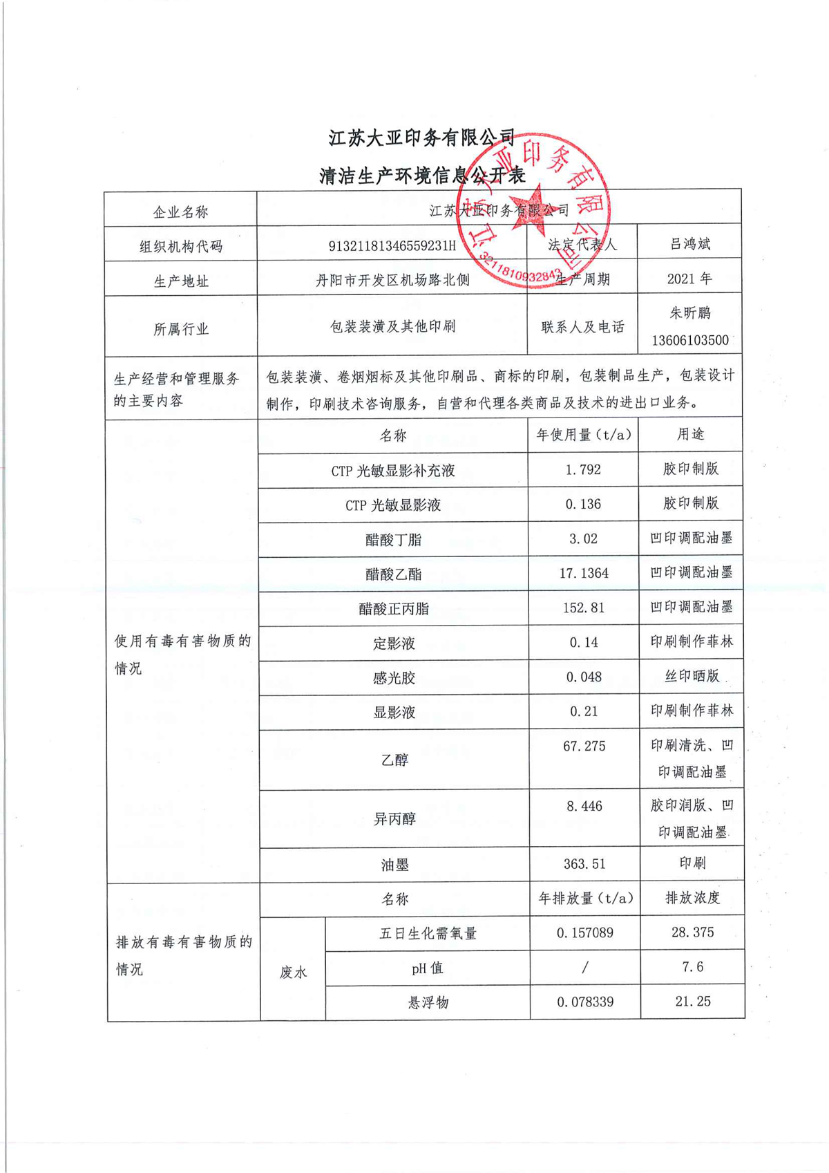 江蘇大亞印務有限公司 清潔生產環境信息公開表