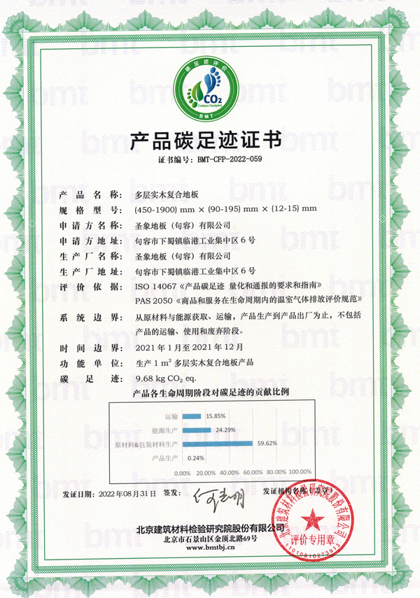 生產(chǎn)1m2多層實(shí)木復(fù)合地板產(chǎn)品的碳足跡:9.68 kg CO2 eq。